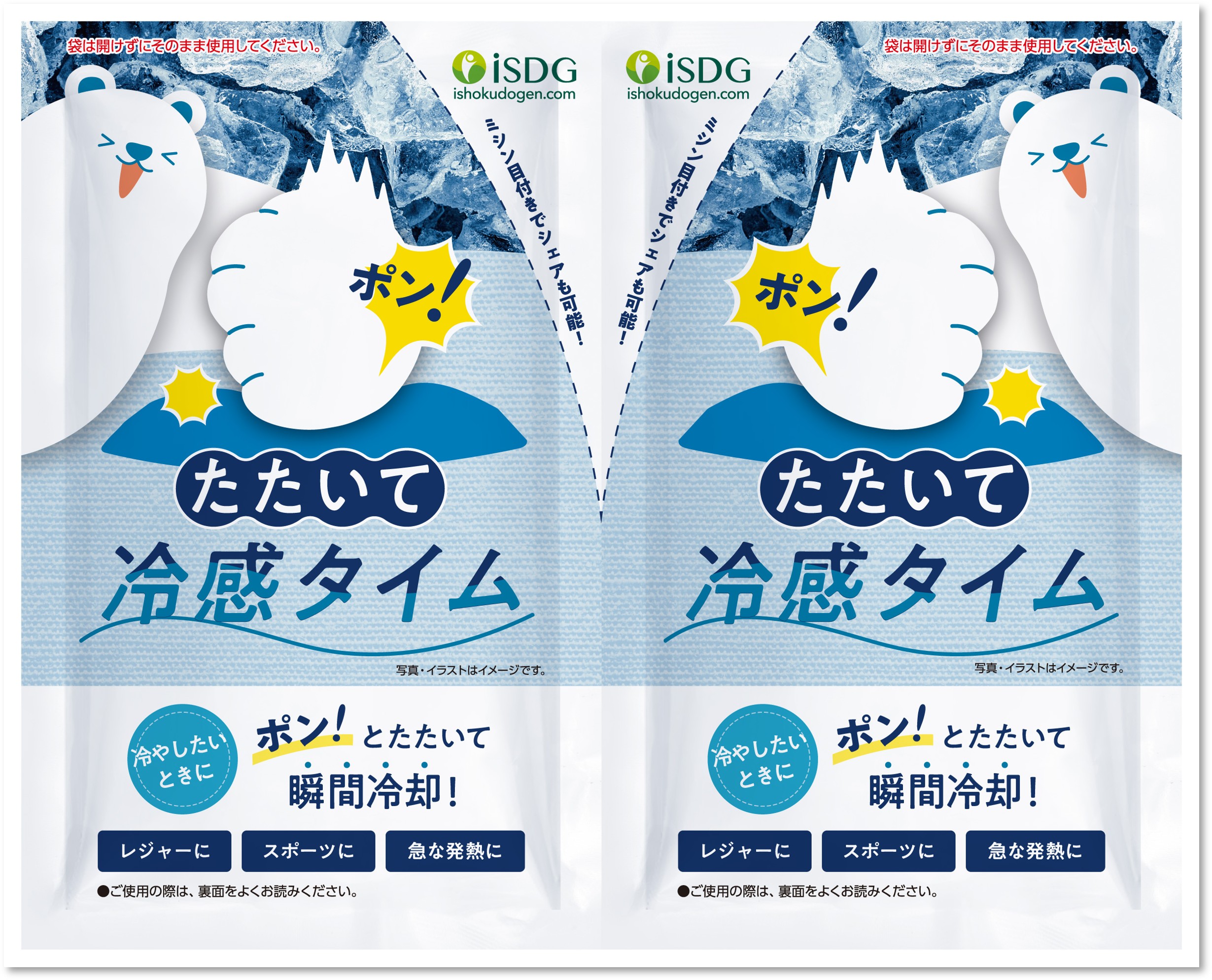 外袋の上から「ポン!」と叩くだけで、中の水袋が割れ、尿素と水が反応することで一気に冷たくなる吸熱反応を利用した冷却パック。